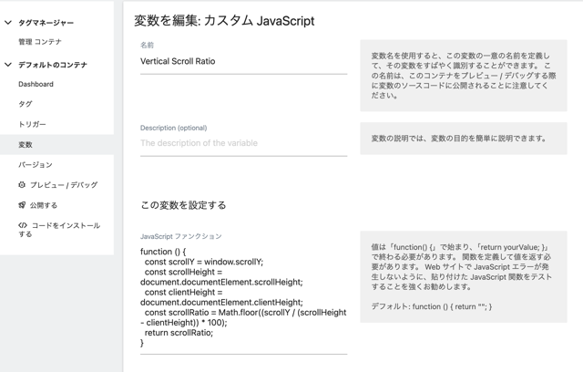 記事冒頭の場合と大きく違うのは、Event Valueに「{{Vertical Scroll Ratio}}」とすることです。これは先程作成した変数です。