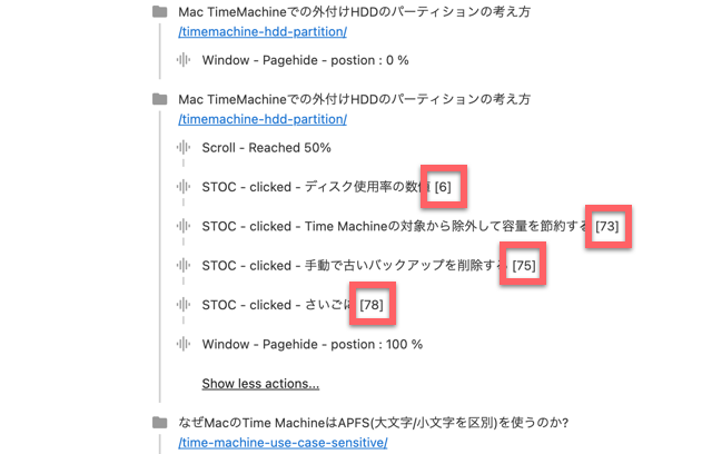 これと同じ方法で、サイドバーの目次のクリックも記録できます。ただ、サイドバーの場合、記事冒頭と違って、記事のどの部分にいる時にクリックしたかも重要です。記事の中盤なのか、後半なのかでは意味が変わってきます。以下はスクロール位置をパーセントで表示したものです。0は記事の最上部、100が記事の最下部ということです。