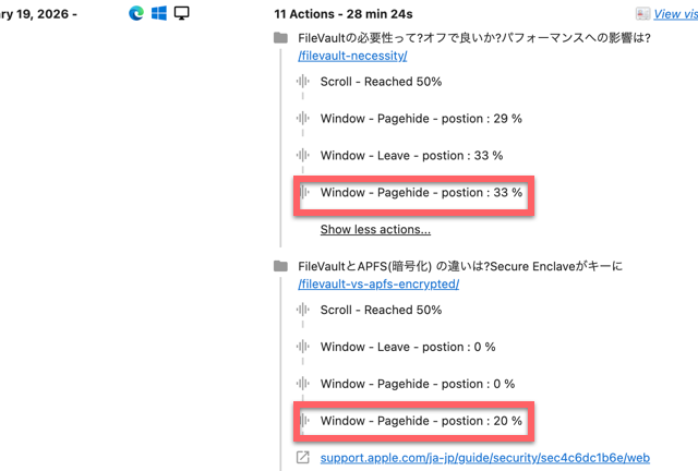 ただ、内部リンクや外部リンクをクリックした場合は時間は明らかなので不要ですが、pagehideは発動してしまいます。ちょっと情報量が多くなりすぎますが、とはいえ、どのスクロール位置からクリックしたかわかるようになるので無駄ではないですが。